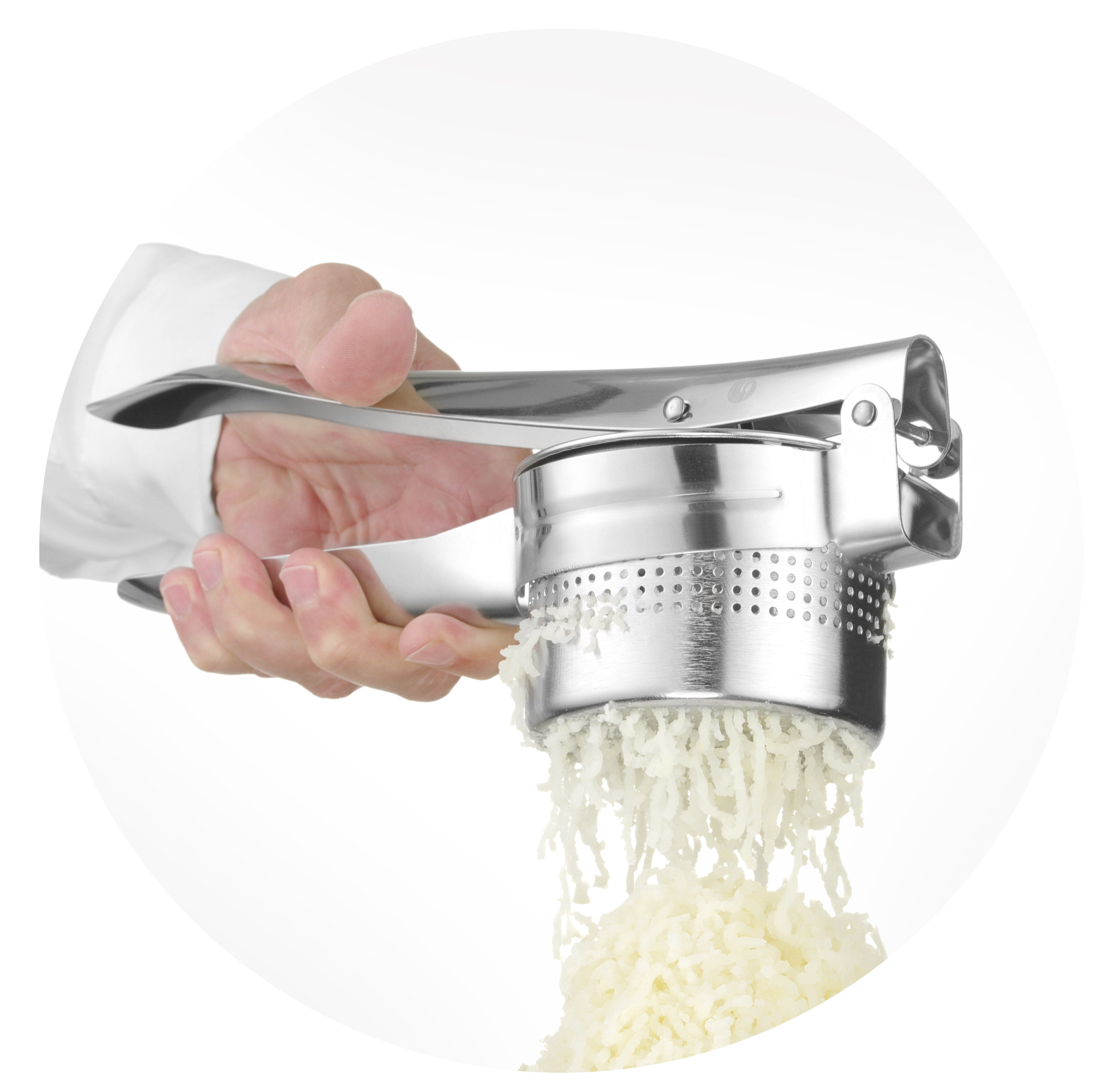 De HENDI Aardappelpers zorgt voor perfect luchtige aardappelpuree zonder klontjes. De solide handgrepen maken persen moeiteloos en de verwijderbare zeef zorgt voor eenvoudige reiniging. Deze pers is ideaal voor professionele keukens en is een handig hulpmiddel om consistent gladde puree te bereiken.