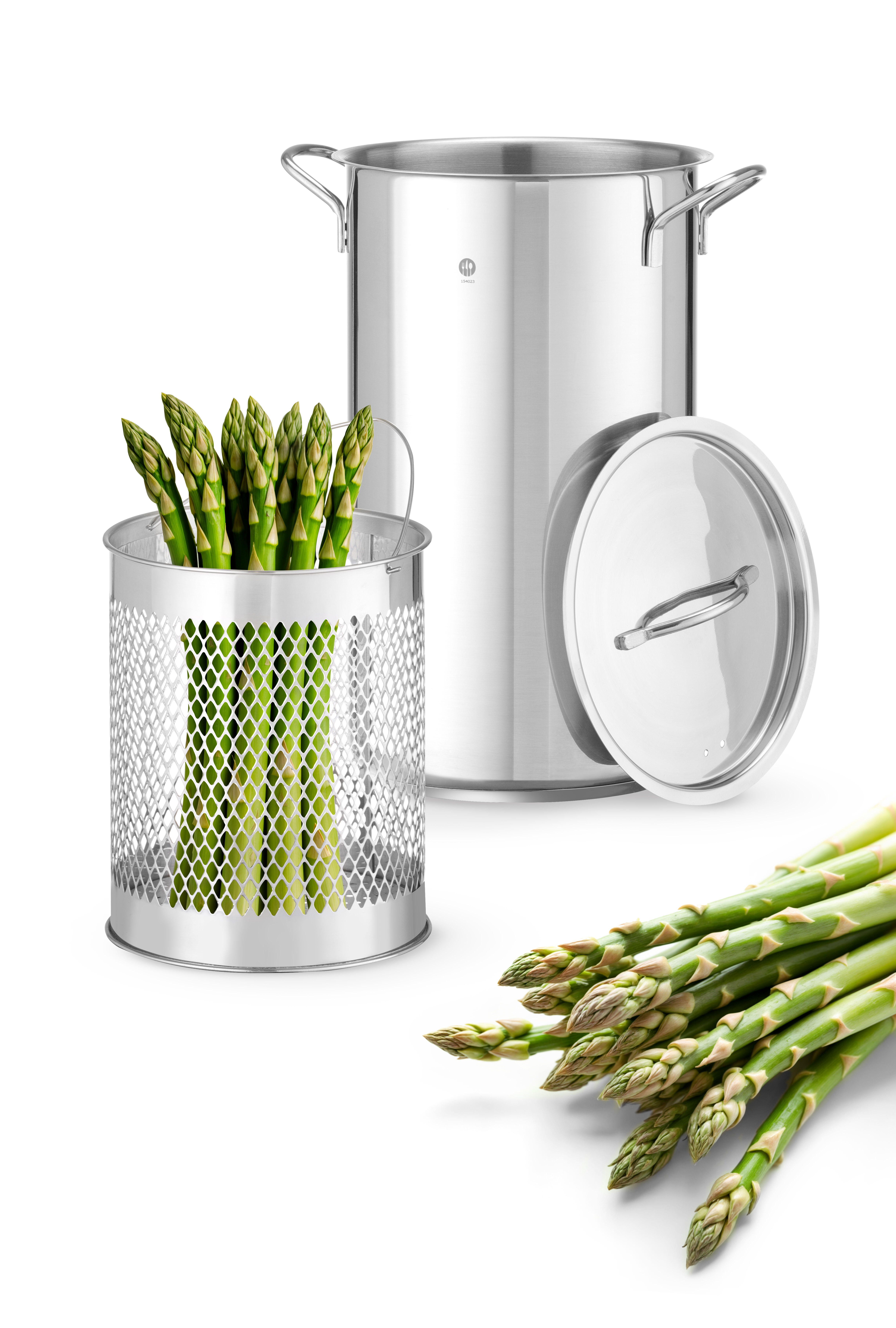 Set bestaat uit pan, stoommand en deksel. Extra hoog voor lange asperges en andere lange producten zoals spaghetti.