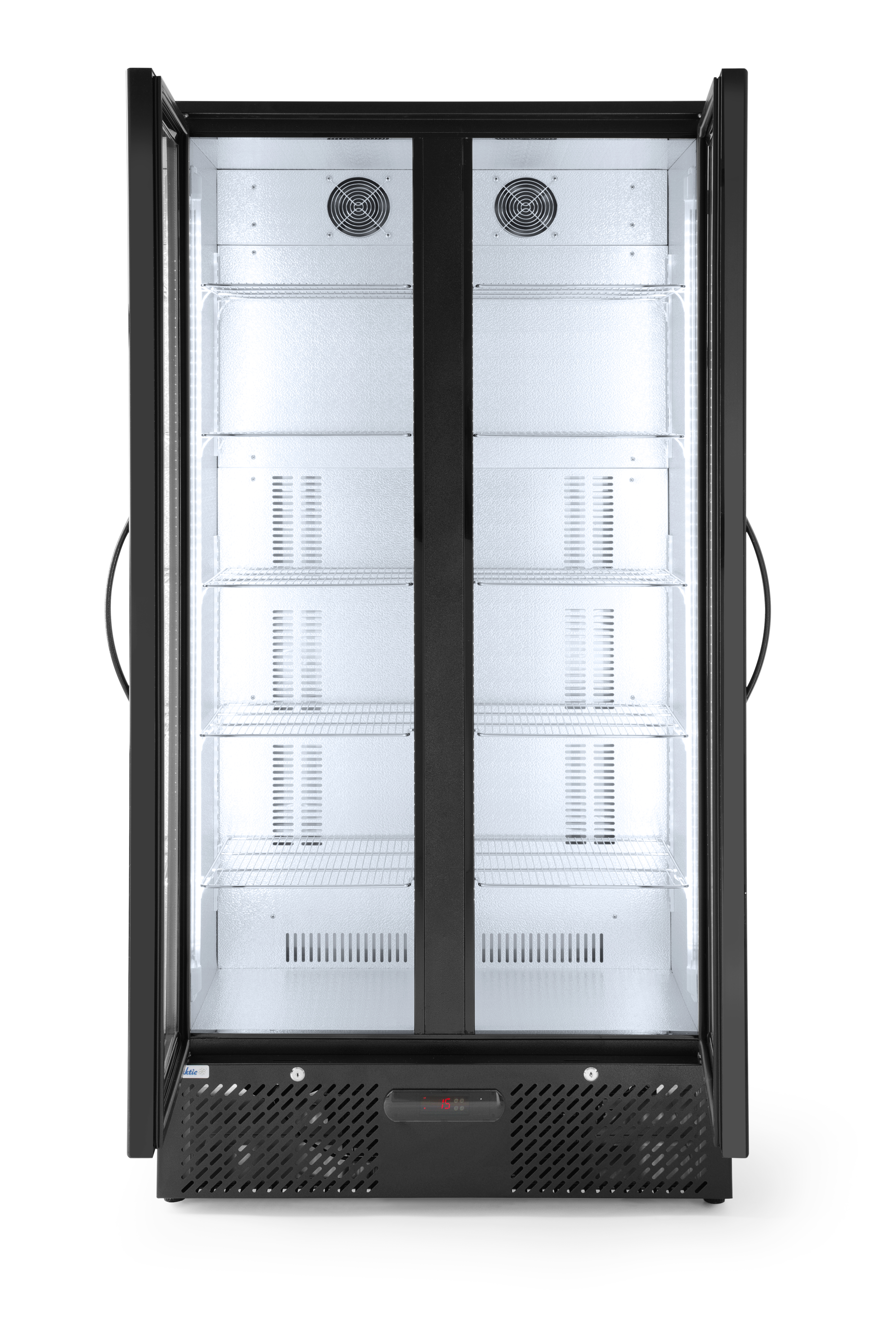 Ruime barkoelkast met deuren van gehard glas. Uitgerust met LED-verlichting om producten te presenteren.