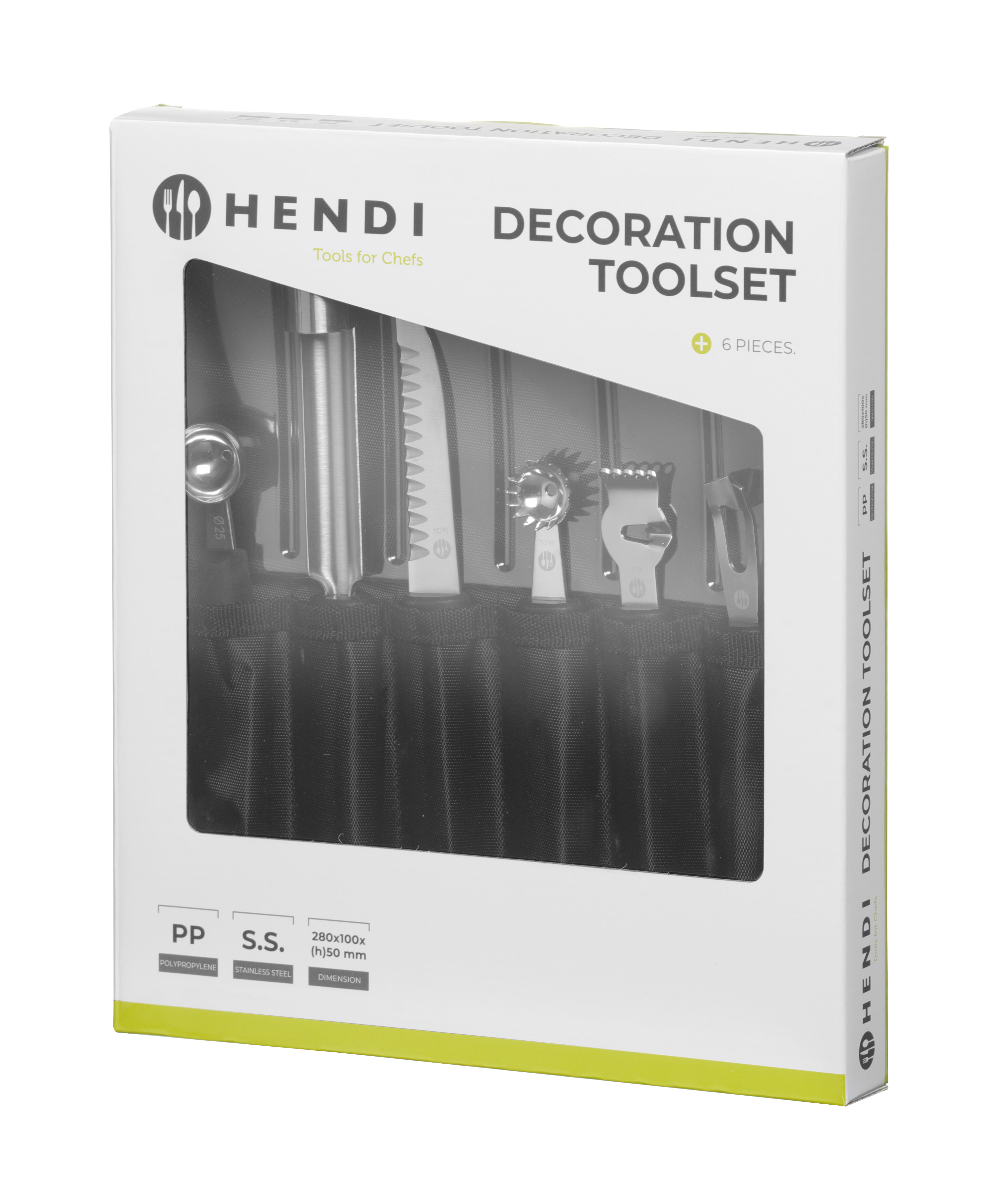 Set van Hendi decoratiemessen met 6 uiterst handige tools verpakt in één koffer. Nu heb je altijd het meest essentiële gereedschap bij de hand: fruit bolletjeslepel gekarteld, fruit bolletjeslepel dubbelzijdig, citroen/sambal trekker, kanaalmes, 20 mm fruitboor en decoratiemes.