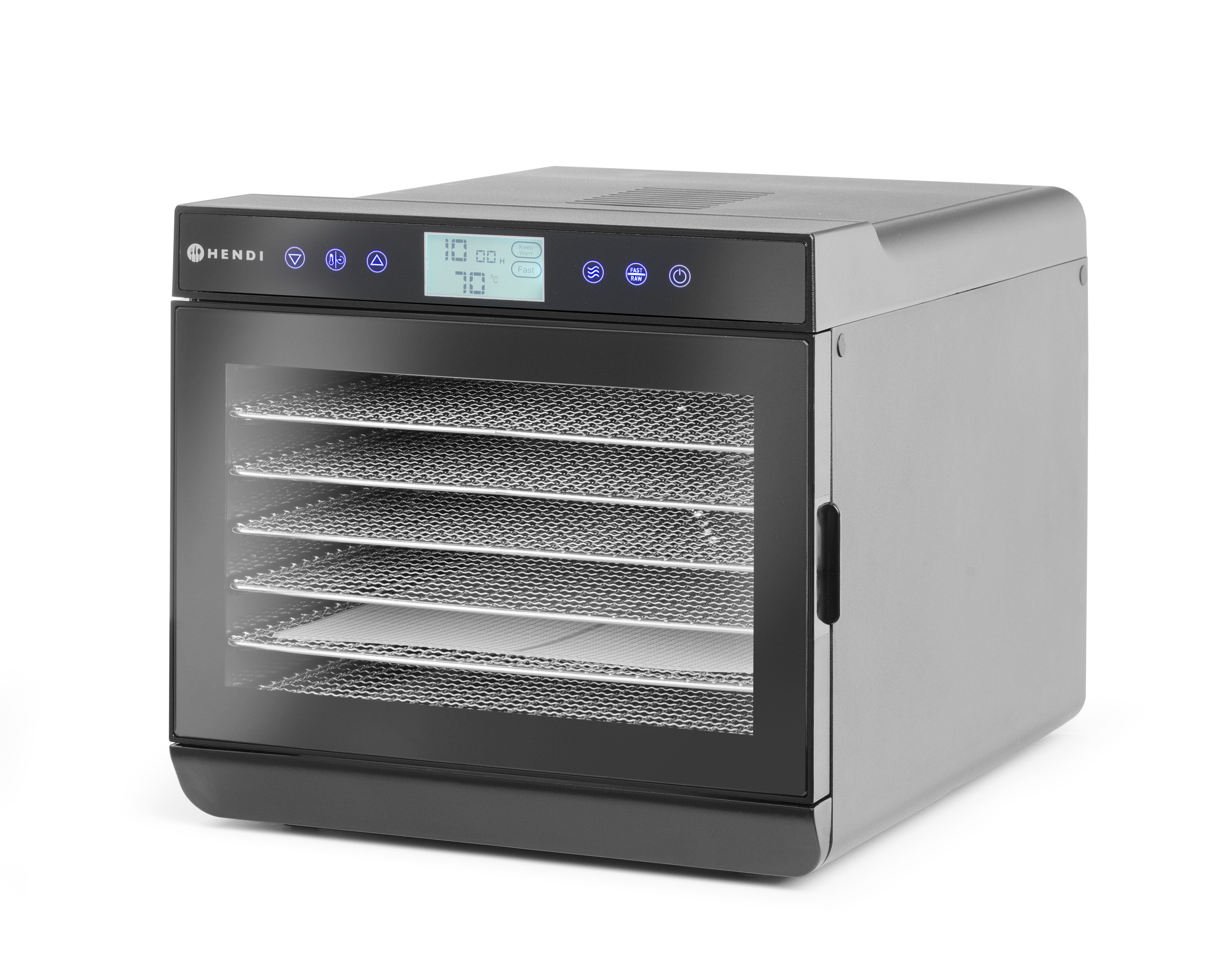 De functionele Hendi Voedseldroger Kitchen Line is perfect voor het drogen van champignons, fruit, groenten en kruiden. Dit apparaat maakt het mogelijk dat het gedroogd voedsel zijn voedingswaarden en unieke geur en smaak lange tijd behoudt.