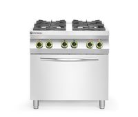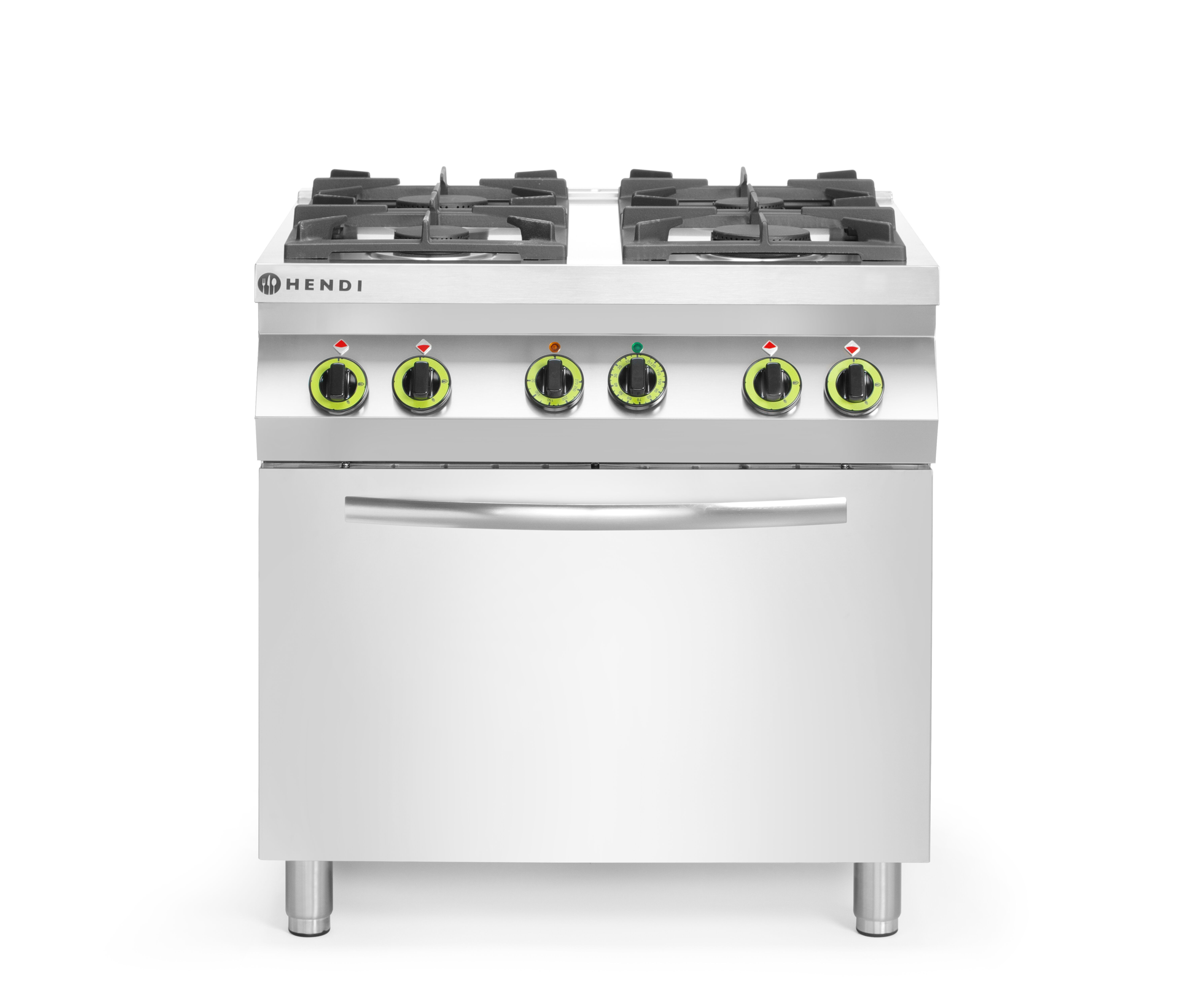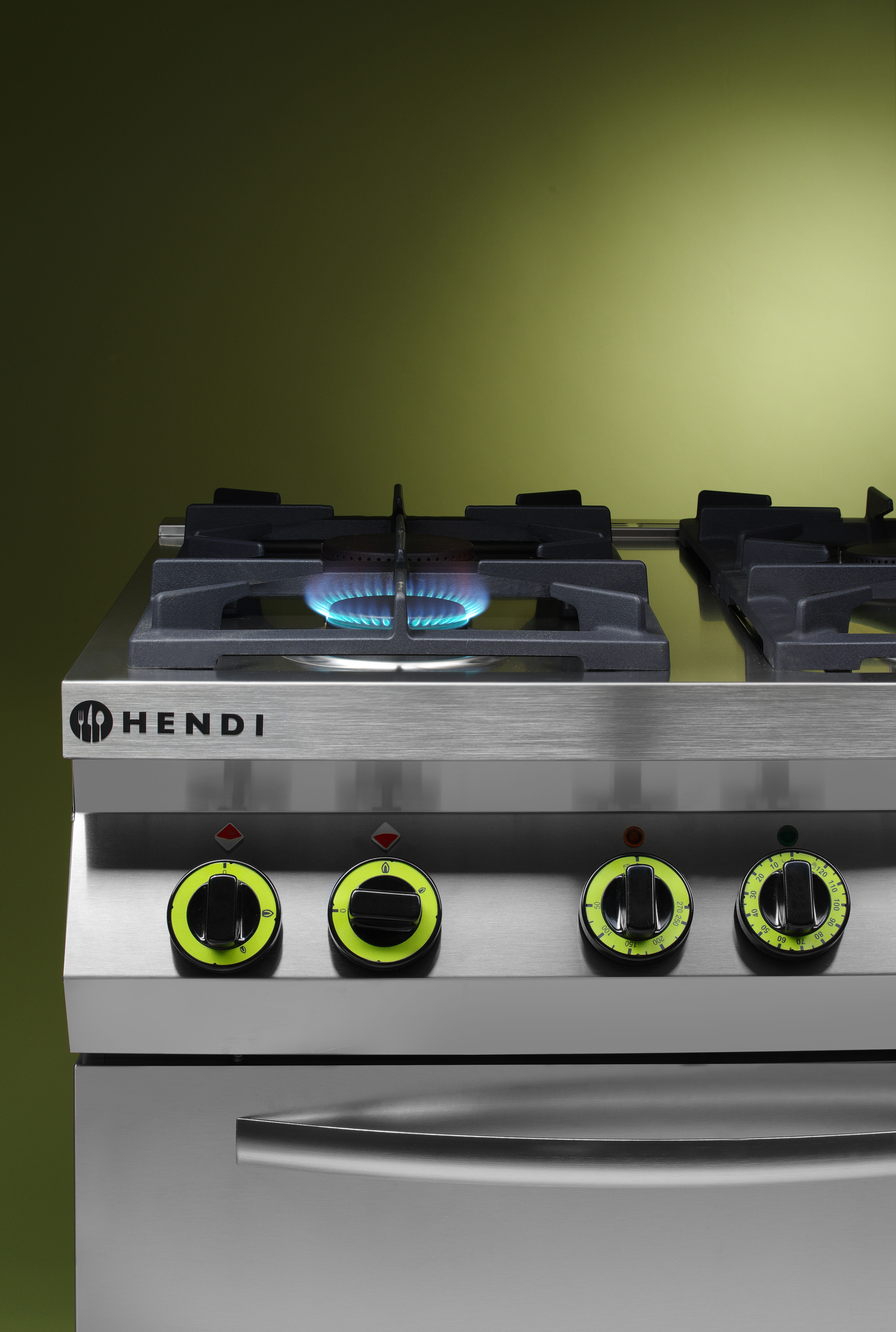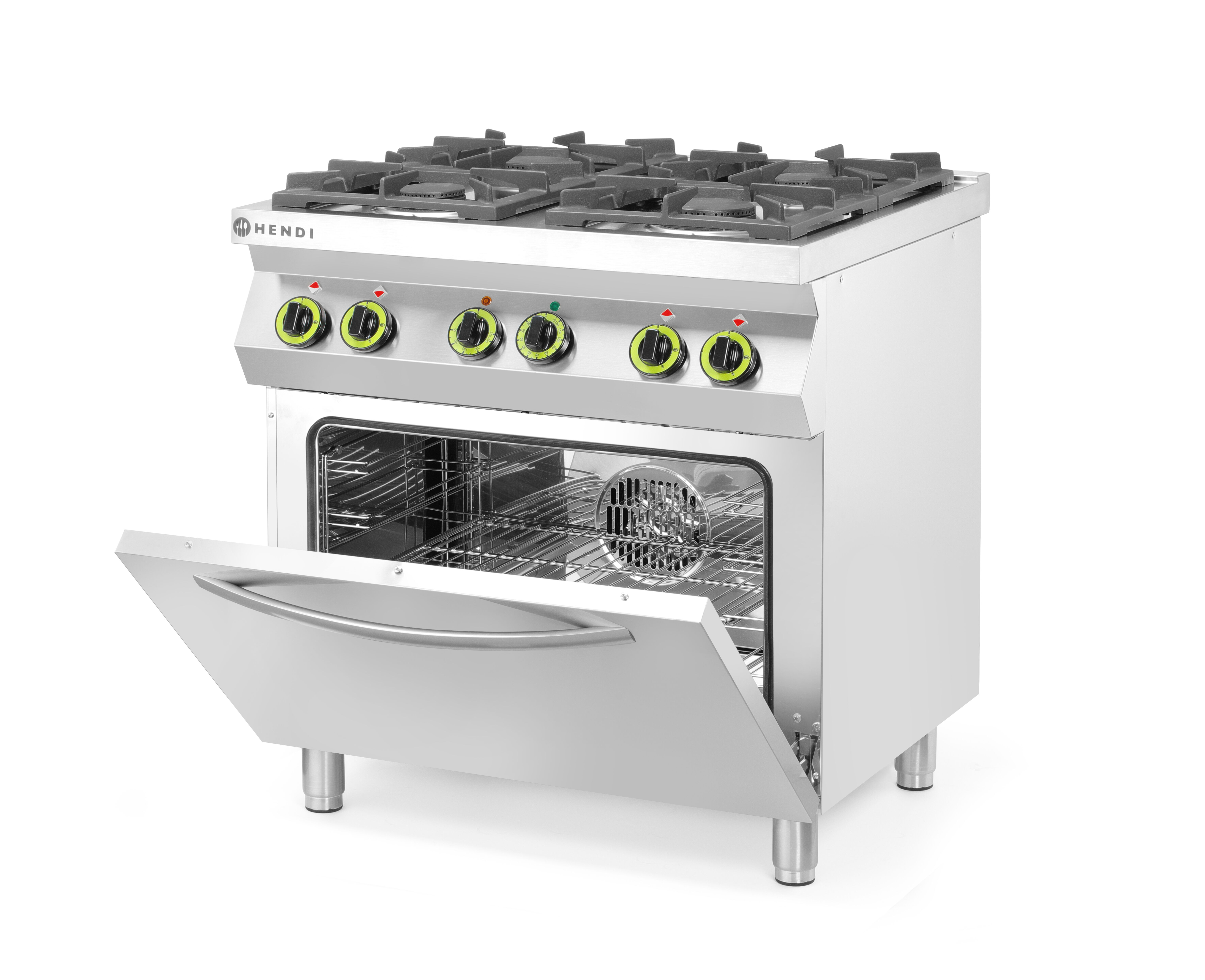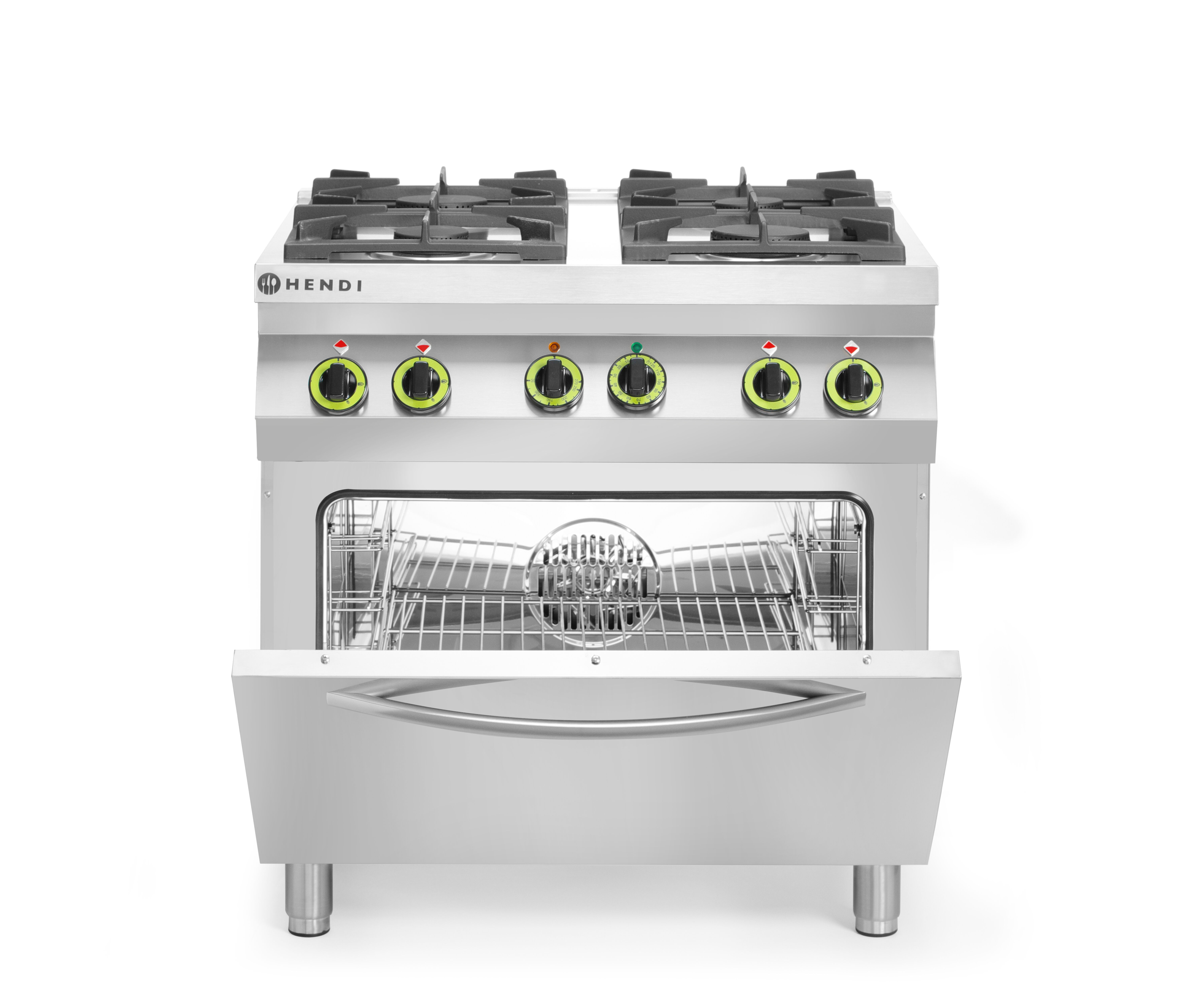 De HENDI Gasfornuis 4-pits Kitchen Line met convectieoven GN 1/1 heeft 4 branders in combinatie met een grote oven. De branders hebben 2x 3,5 kW en 2x 6,0 kW en zijn geschikt voor pannen tot ø 300 mm. De grote oven biedt ruimte voor 4 GN 1/1-bakken of roosters en wordt geleverd met een rooster.