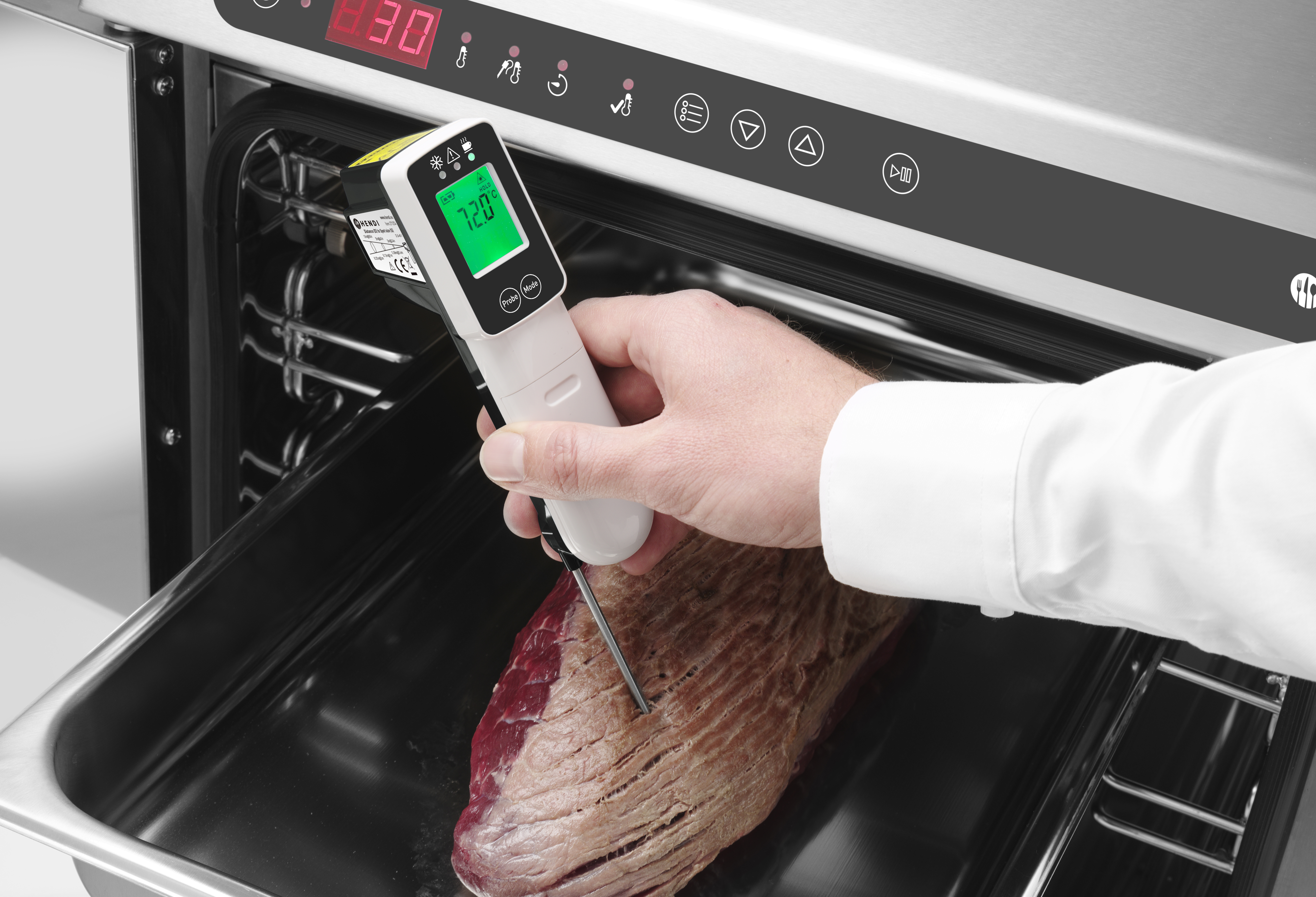 Temperatuur wordt gemeten door middel van infrarood of de inklapbare sonde.