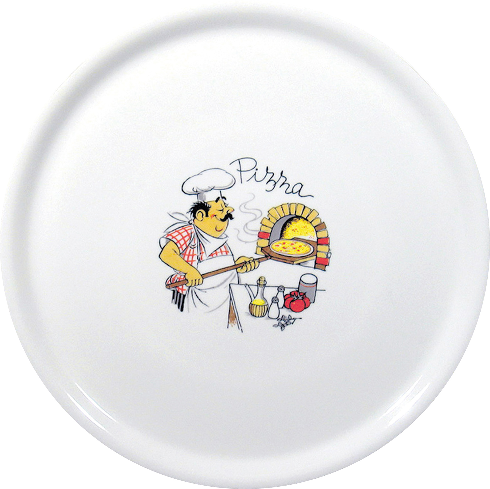 Het HENDI Pizzabord Traditional is ideaal voor het serveren van pizza dankzij de perfect vlakke vorm en de diameter. Het grappige patroon – een foto van een pizzaman laat het bord opvallen. De decoratie bevindt zich onder het glazuur, waardoor het vaatwasmachinebestendig is.