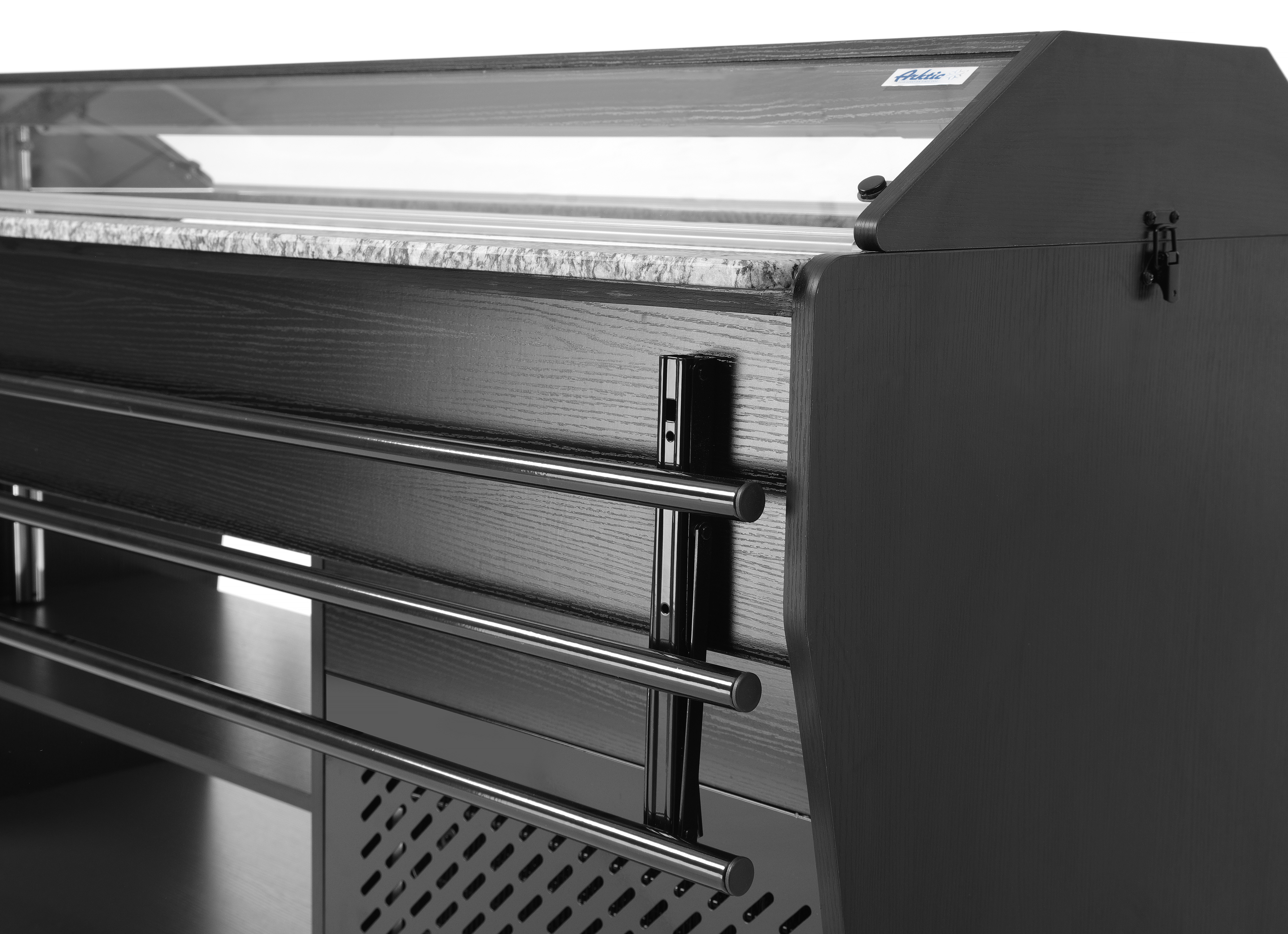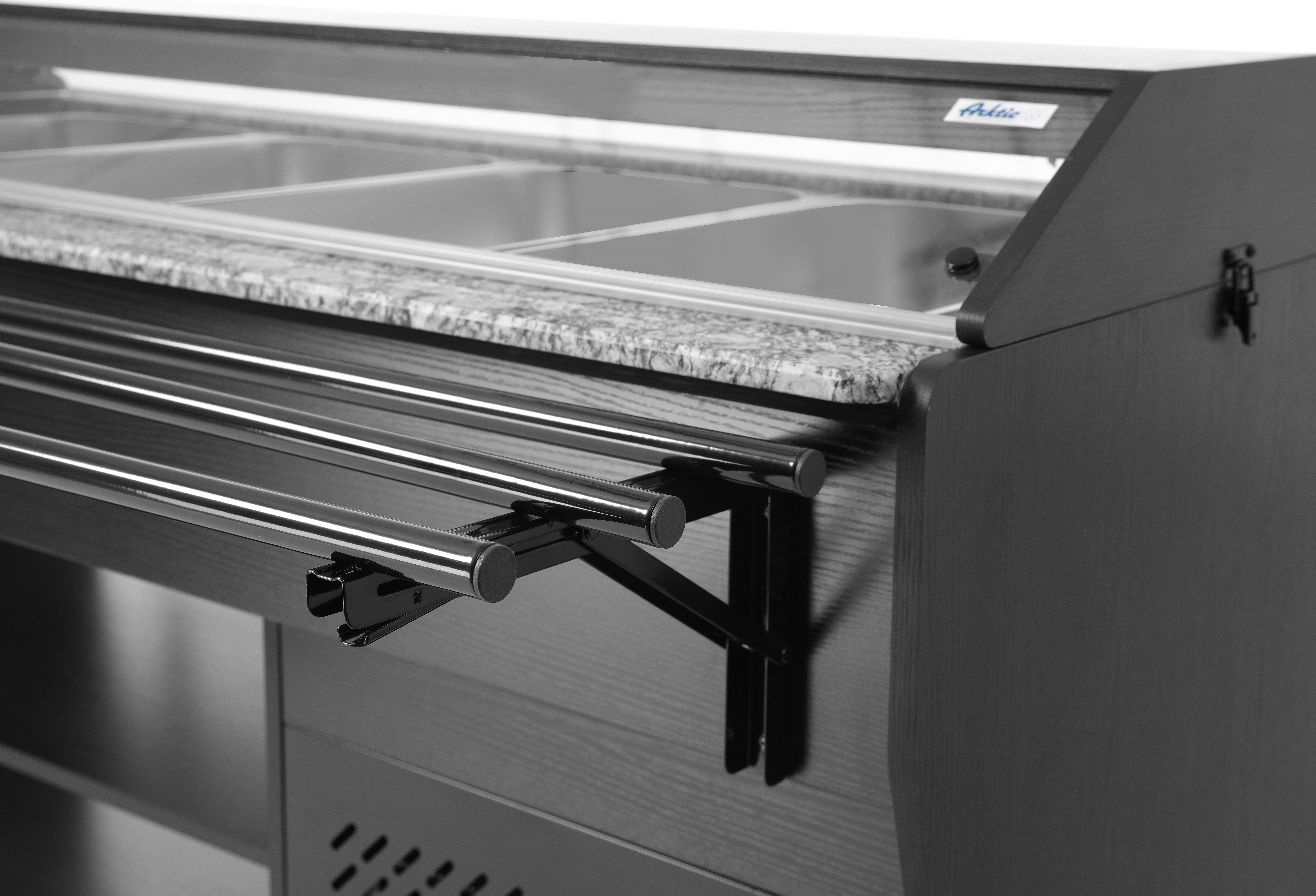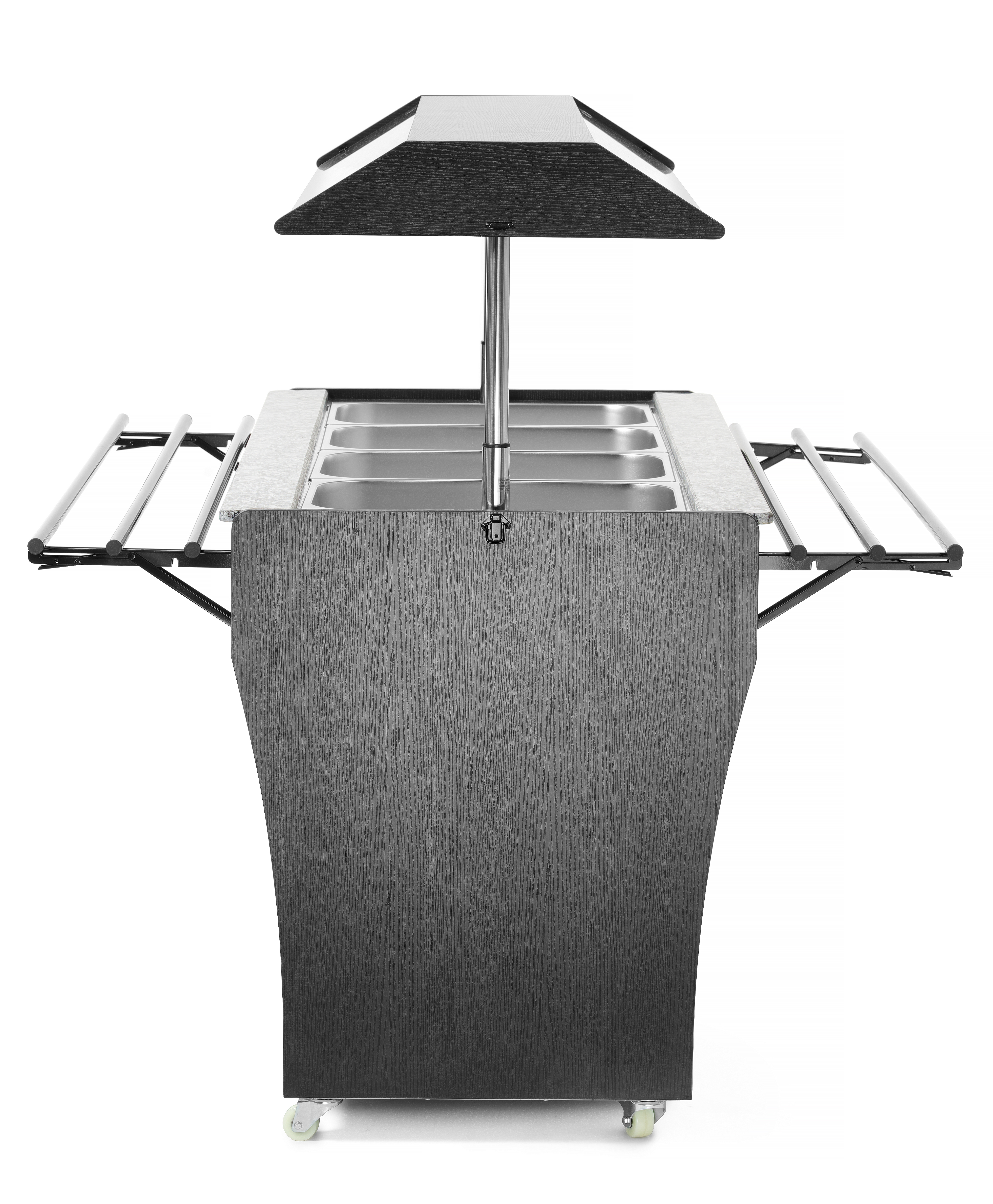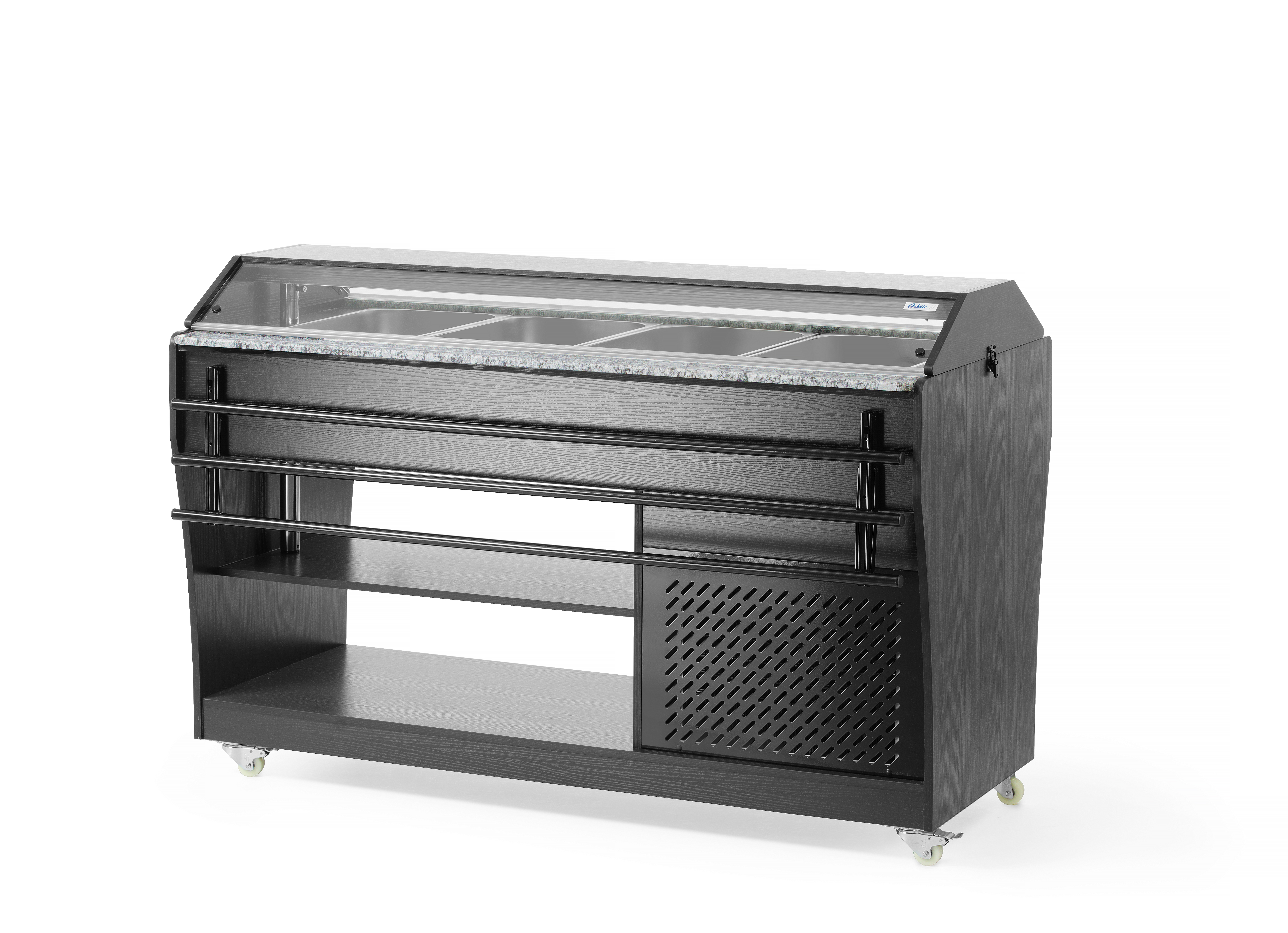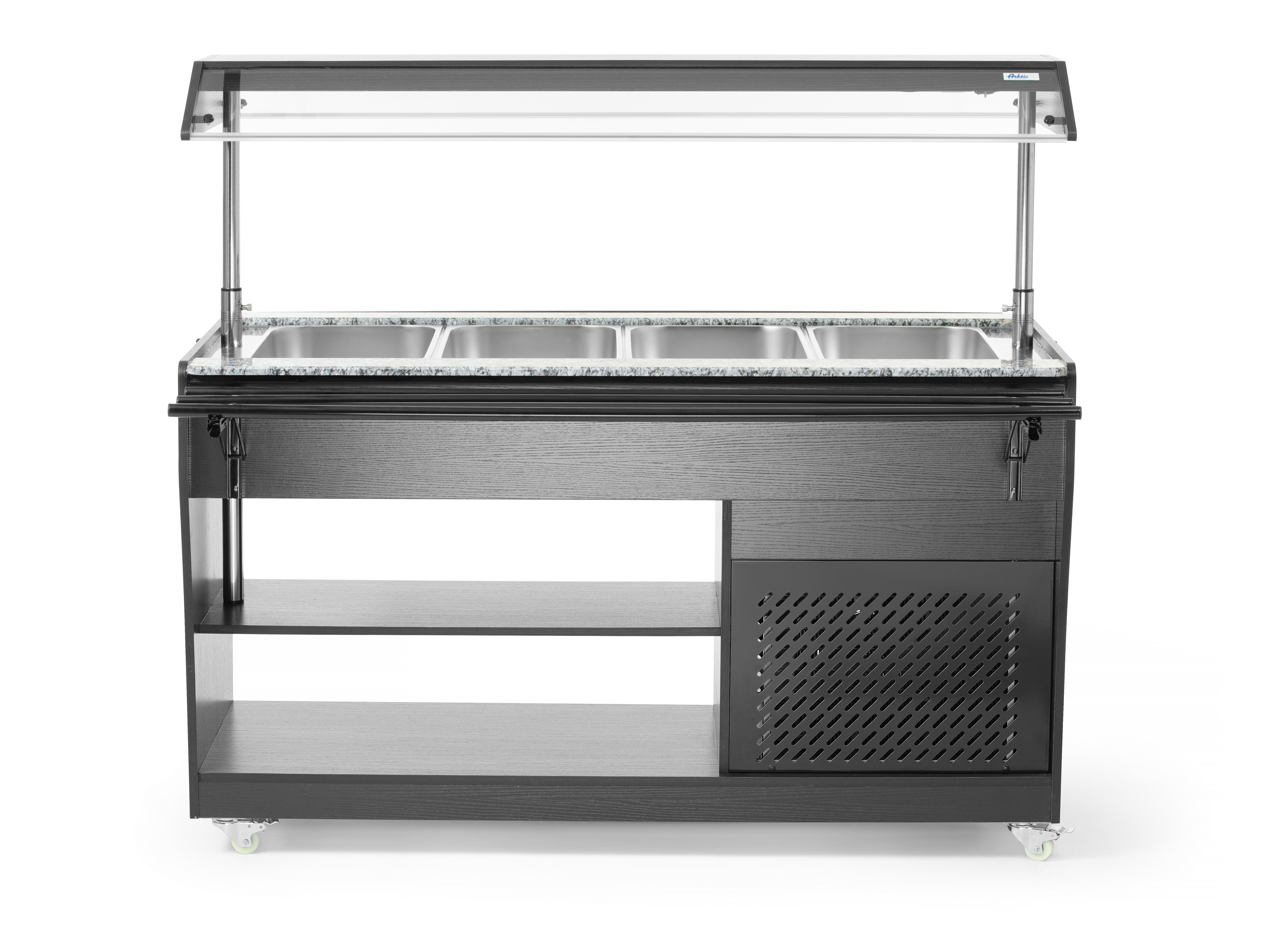 Het Arktic Salad-buffet biedt ruimte voor 4 GN 1/1-containers, die bij de set zijn inbegrepen. Het buffet is uitgerust met verlichting in de luifel, heeft 2 planken eronder voor het opbergen van borden en bestek en is gemakkelijk te verplaatsen dankzij 4 zwenkwielen. Dit buffet is de ideale oplossing voor zelfbedieningsgelegenheden of evenementen, omdat het aan beide zijden een plank voor dienbladen heeft en ervoor zorgt dat voedsel perfect koel wordt gehouden.