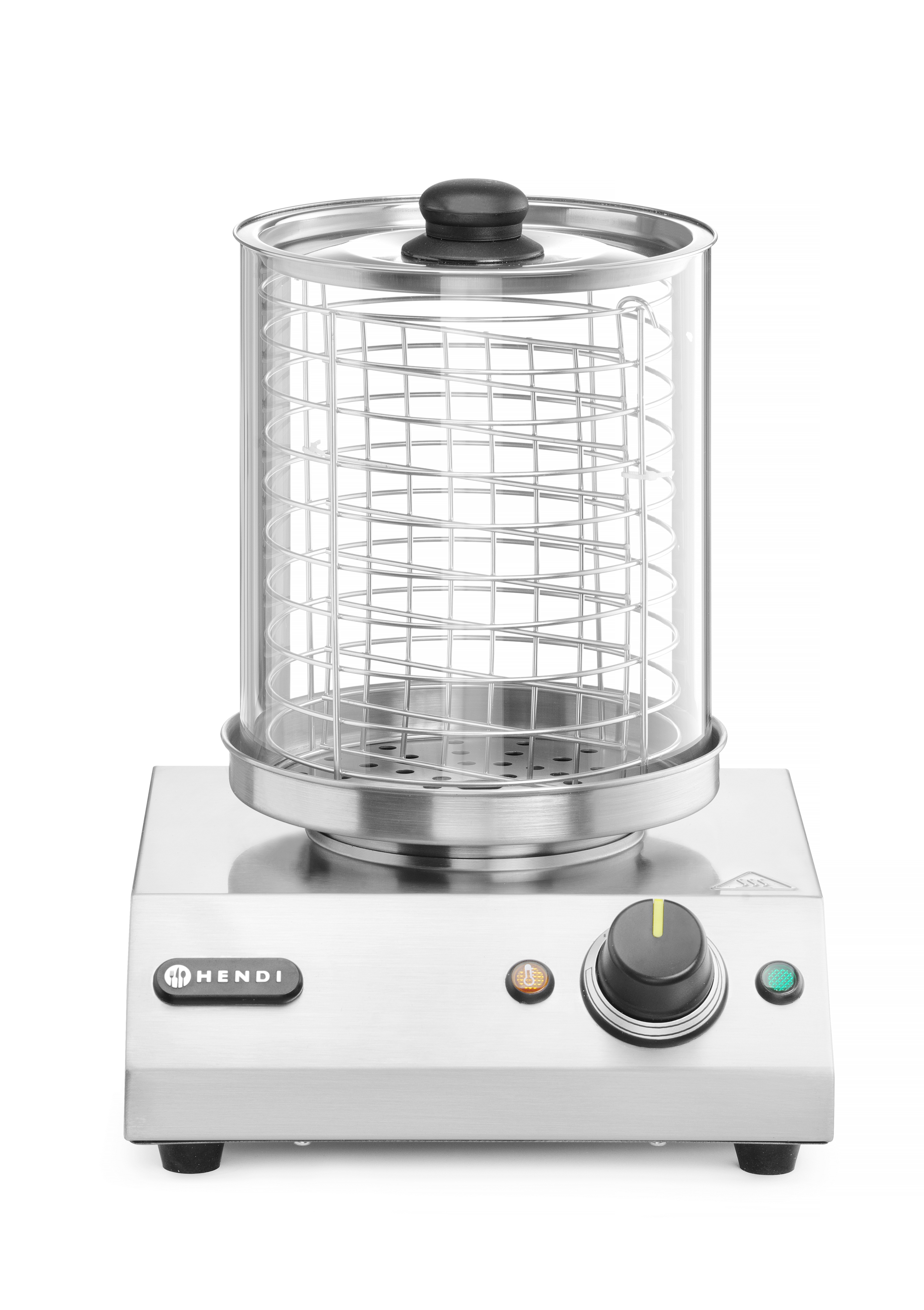 De HENDI Worstenwarmer heeft een grote glazen container om worstjes tegelijkertijd op te warmen en te presenteren. De mand is uitgevoerd met een verdeler waarmee twee soorten worst tegelijk kunnen worden opgewarmd.